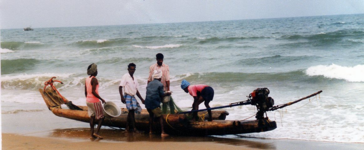Sur la plage nous assistons au départ de pêcheurs qui franchissent la barre sur des pirogues construites avec trois troncs d’arbres .