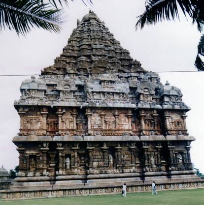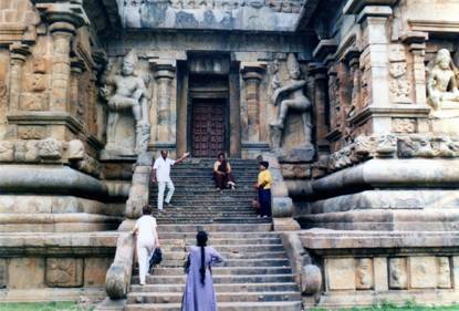 Le vimana du temple est pyramidal et monte jusqu’à une hauteur de 55 metres, Autour de sa base se trouvent des niches avec diverses statues de Shiva, Parvati et même Vishnu. Près de l’entrée nord est une représentation de Shiva et Parvati qui posent une guirlande autour du cou de Rajendrah 1er , le chef Chola du onzième siècle qui à conquis le pays jusqu’au Gange au nord et qui serait revenu avec de l’eau du fleuve sacré.