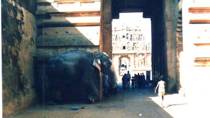 La porte du Temple de Brihadishvara est gardée par un éléphant .