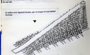 Comme pour les pyramides d’Egypte on se demande comment on a pu monter la pierre de 80 tonnes : deux hypothèses s’affrontent une rampe helicoidale de terre ou une rampe rectiligne de bois ???