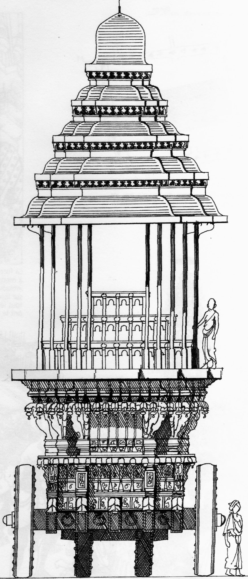 Sur internet nous trouvons un article de J.DUMARCAY sur l’architecture des chars processionnels du sud de l’Inde :