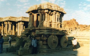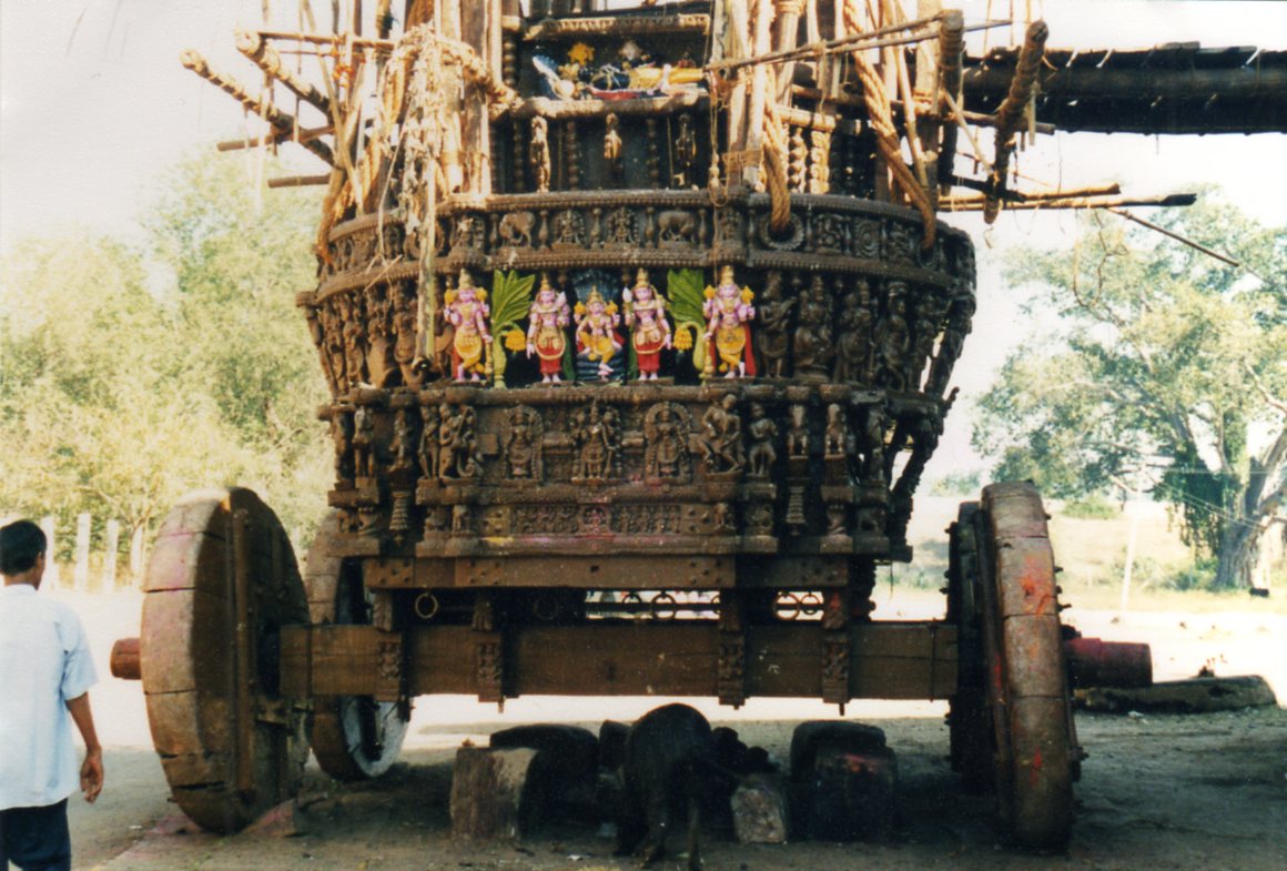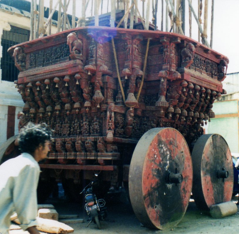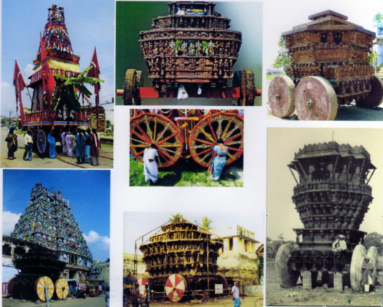 Les chars sur lesquels sont promenée ,en dehors des temples , les divinités du Sud de l’Inde , sont construits en bois avec parfois des roues de pierres .