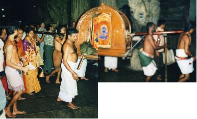 Dans la rue nous découvrant un char de procession , véritable temple mobile , construit en bois , comportant un pavillon abritant qui abritera la statue de la divinité .