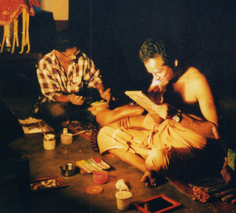 début du spectacle et nous assistons à l’arrivée des danseurs qui se maquillent sur la scène Les maquillages, très complexes, sont réalisés à partir de pâtes de riz par des artistes spécialisés