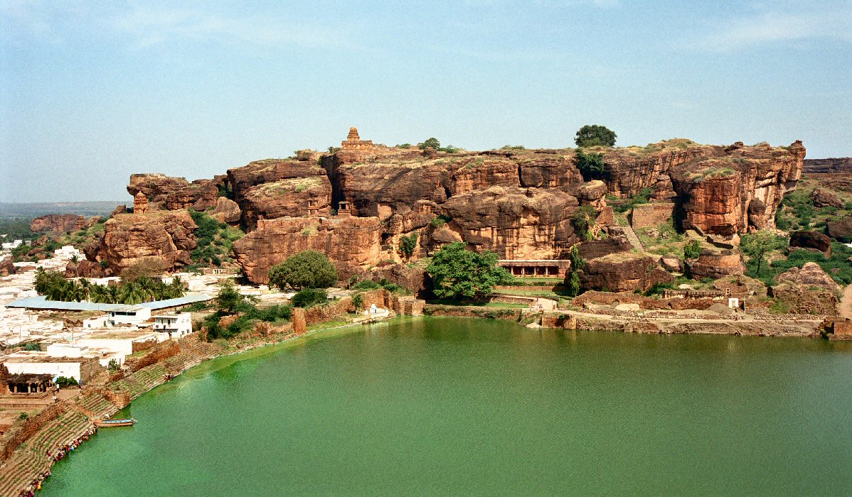 Badami fut aux VIe siècle et VIIe siècle la capitale de la puissante dynastie des Calukya .Le village est situé au pied de l’ancien barrage du lac artificiel d’Agastya, au creux de falaises rouges marbrées, creusées de sanctuaires rupestres spectaculaires et surmontées de constructions anciennes. Les quatre sanctuaires excavés à la fin du VIe siècle[ dans la pierre marbrée de la falaise constituent un ensemble spectaculaire .