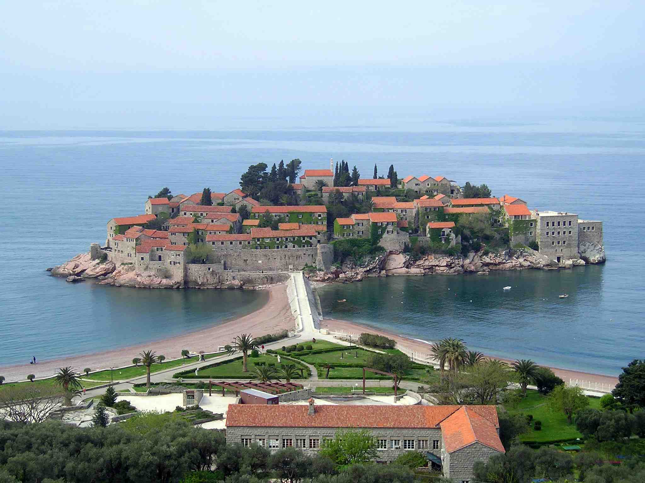 Ancien village de pêcheurs fortifié datant du 15ème siècle, elle est construite sur un îlot rocheux reliée à la côte par un étroit isthme de sable. En 1960, sous l’impulsion de Tito, l’île se métamorphose en un village-hôtel de luxe, symbole du pays et haut lieu de villégiature pour les personnalités royales, politiques, de la mode et du cinéma.