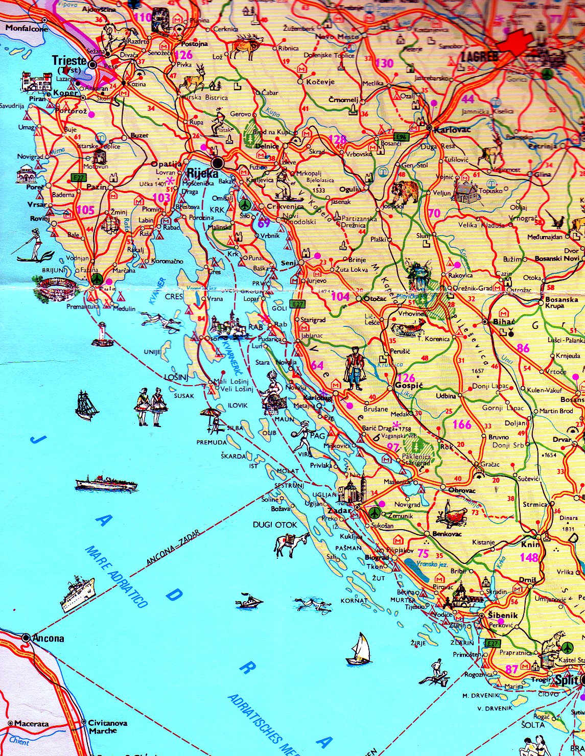 Nous nous procurons la carte des routes carrossables en 1963 , qui en dehors de l’autoroute Zagreb-Belgrade (à deux voies construite par les chantiers de jeunesse ) , ne comporte que peu de routes « en macadam » …le reste est qualifié prudemment de « routes en construction » .