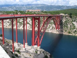 La route devient « roulante » et moderne en arrivant sur le magnifique Pont de Maslenica c’est un pont en arc qui enjambe le détroit Novsko Îdrilo (ou Détroit de Maslenica) entre la Mer de Novigrad (Novigradsko More) et le Canal de Velebit (Velebitski Kanal) . Il mesure 315,3 mètres de long, 10,5 mètres de large et il est situé à 55 mètres au dessus de l’ eau.