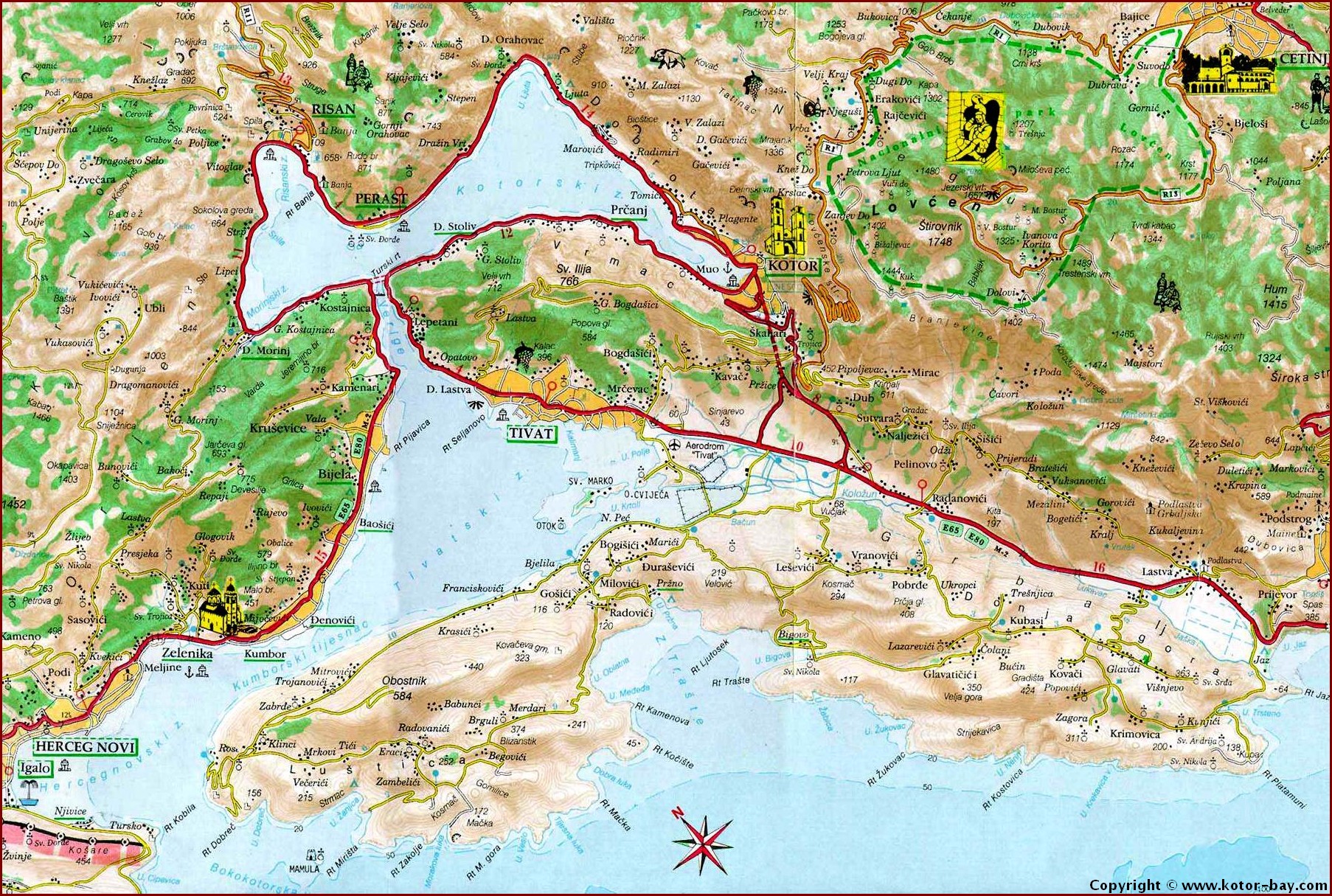 Vers l’intérieur, les longs murs de la ville de Kotor se trouvent prolongés vers le bastion Saint-Jean, sis à une altitude de 280 mètres au-dessus de l’eau, les bouches de Kotor sont dominées de 1 894 m par la plus haute montagne de la côte adriatique .