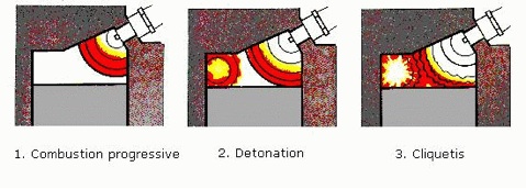 (La combustion du mélange dans le cylindre commence normalement après l’étincelle. Mais il arrive que combustible comprimé atteint son point d’auto-allumage et s’auto enflamme à plusieurs endroits. Les micro explosions qui en résultent produisent des vibrations , elles sont très vives et peuvent rapidement créer des points chauds qui accentueront encore plus le problème. L’accumulation de micro explosions va arracher ou faire fondre une petite quantité de métal sur le sommet du piston ou sur les parois du cylindre et des segments. Au bout de quelques temps (selon l’intensité) cela conduira à la destruction du piston, des segments ou des parois du cylindre !!!! .