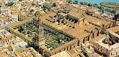 La Mezquita de Cordoue ( la mosquée cathédrale)L’édifice original , commencé en 785 par Abd Rahman 1er comprenait le « patio de los naranjos » voisin de la salle des prières comprenant 11 nefs séparées par des rangées de colonnes de marbre provenant d’édifices romains . La longueur de la mosquée fut allongée par Abd al Rahman 2 en 848 et par Al Hakam 2 en 961 . Chaque fois le mihrab a été reconstruit Lorsque Cordoue fut reprise par les chrétiens en 1236, ceux-ci en firent une cathédrale. Ils murèrent l’ouverture entre la cour et la salle de prière, ne conservant qu’une porte d’entrée (Puerta de las Palmas). Ils abattirent quelques rangs de colonnes pour dégager la place de la Chapelle Royale décorée de stucs mudéjars.Au XVe siècle, les chanoines du chapitre décidèrent de doter leur cité d’un édifice beaucoup plus somptueux . Ils firent démolir une partie importante du centre de l’édifice pour y édifier une cathédrale qui est incrustée dans la mosquée, rompant les perspectives de la forêt de colonnes. La photo aérienne permet de comprendre comment la cathédrale « surgit » au centre de l’édifice .