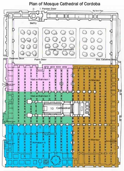 En effet lorsque les musulmans s’établirent à Cordoue, ils exproprièrent les chrétiens du terrain de l’église Saint-Vincent, non loin du Guadalquivir, construite par les Wisigoths sur le site d’un temple romain dédié à Janus. L’émir Abd-Al-Rahman Ier ordonna d’y faire construire à la place une mosquée. Elle fut agrandie trois fois de suite par ses successeurs, pour finir par couvrir 23 000 m2 et devenir ainsi la plus grande mosquée du monde après celle de La Mecque. Cette mosquée n’est pas orientée par rapport à la Mecque . Elle se présente aujourd’hui sous la forme d’un vaste quadrilatère d’environ 180 m de long sur 130 m de large, comptant dix-neuf nefs et plus de 850 colonnes surmontées par des chapiteaux de styles différents.