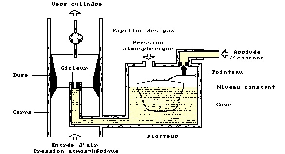carburateur . Pour réguler l’arrivée d’essence un pointeau fixé à un flotteur fermait l’arrivée d’essence . Avant d’être aspiré dans les 4 cylindres , l’air soufflait sur le gicleur en entraînant des fines gouttelettes d’essence qui se transforme en vapeur et rentrent dans le moteur . je ne rappellerait pas les 4 temps du moteur : admission , compression , explosion , détente , chacun des 4 cylindres agissant à son tour pour réguler la rotation du moteur.