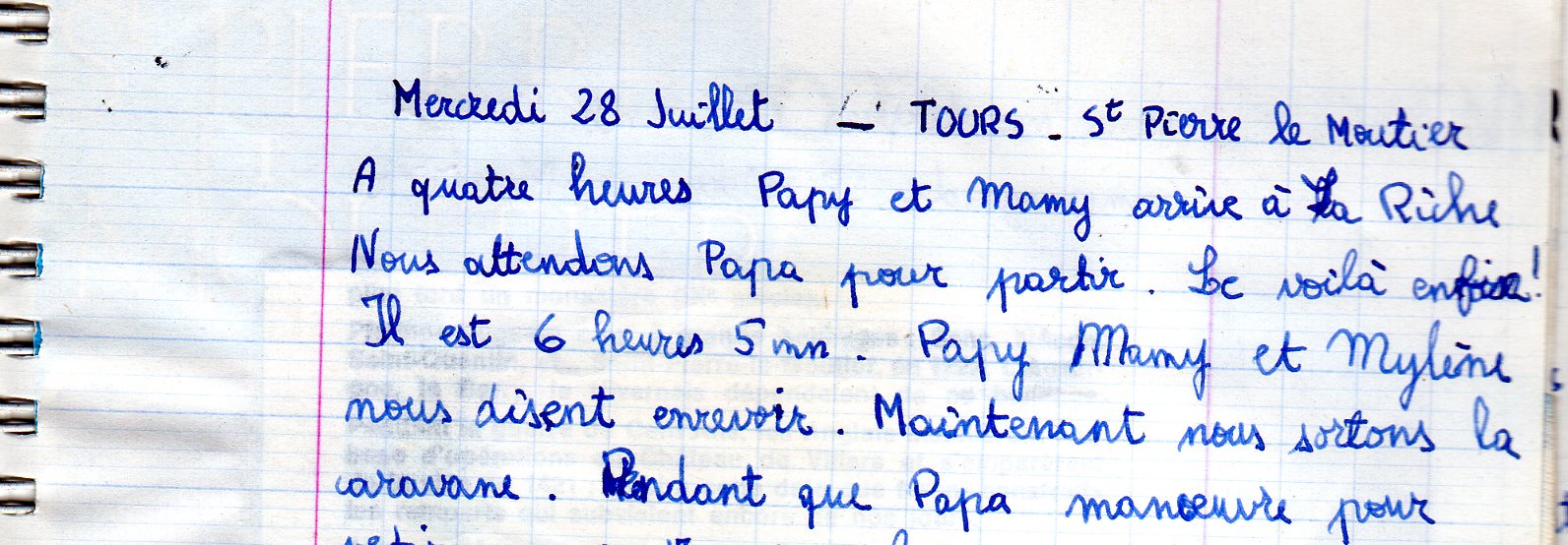 Jeudi 29 juillet : Saint pierre le MoutierNous sommes partis aujourd’hui à 9 heures . Papa roule maintenant depuis une heure . Nous ouvrons la radio pour les informations : J’entends « il y a en ce moment un bouchon de trois kilomètres sur l’autoroute du soleil et 10 kilomètres de bouchons aux alentours de Bordeaux …clic…Papa coupe la radio , la voiture longe un grand canal : Nous passons par les villes suivantes : Moulin , Paray , Macon .