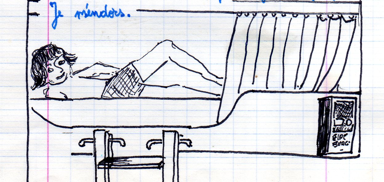 Soudain au milieu d’un beau rêve , une sonnerie me réveille en sursaut . C’est le réveil qui sonne ! Papa remet le lit arrière en table . maman fait chauffer de l’eau . je sors de ma couchette et je m’habille , la tempête s’est arrêtée . Je bois mon chocolat . Papa remonte les vérins , Jean-Marc lui s’habille .