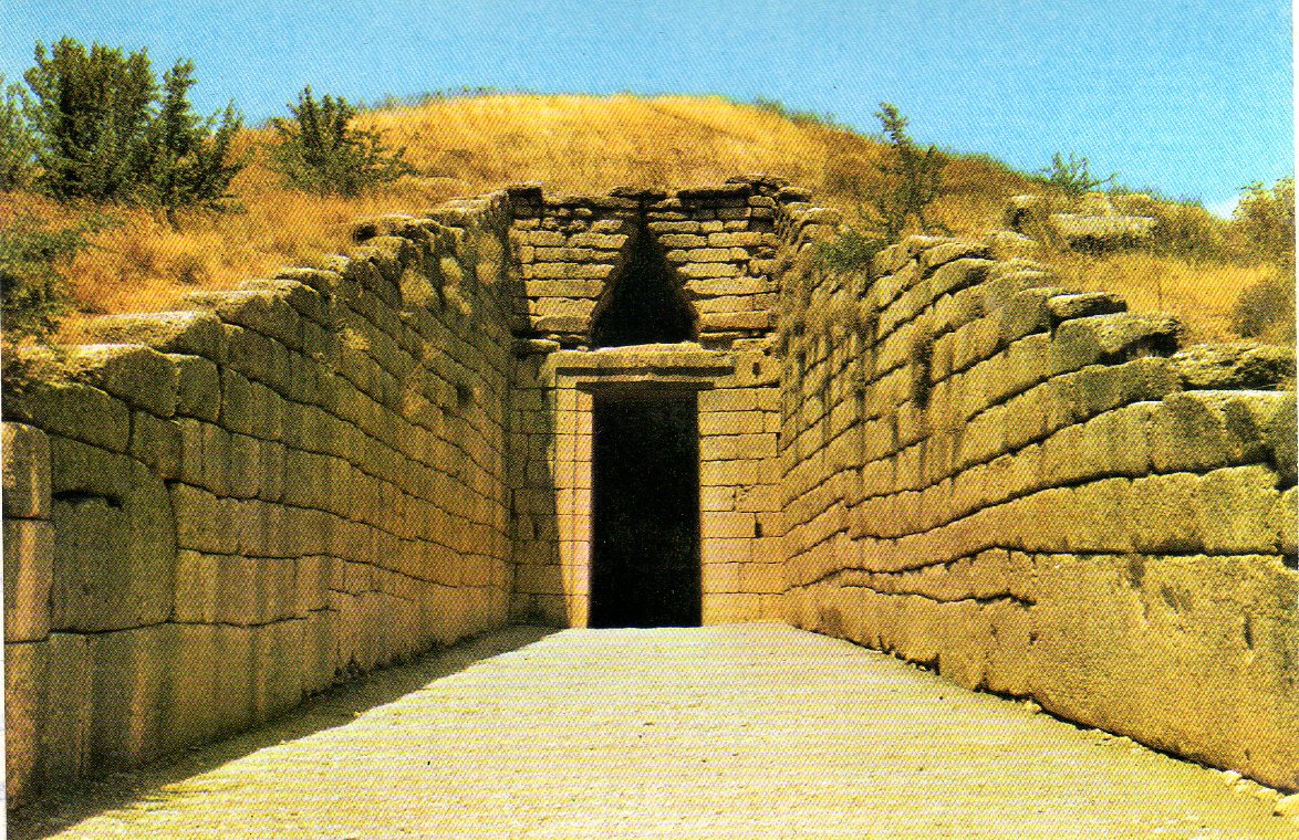 Nous descendons au tombeau d’Agamemnon ; A l’intérieur il fait frais , et nous nous y attardons , le tombeau est une coupole , nous entrons dans un caveau rectangulaire . Jean-Marc et moi allumons nos lampes électriques , nous constatons que c’est creusé dans le roc .