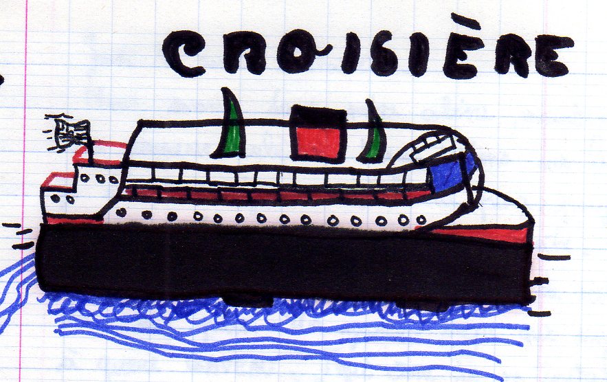 Midi et demie : Jean Marc et moi montons au poste de pilotage . Je vois le gouvernail et la boussole .J’admire la machine qui transmet les ordres aux hommes qui s’occupent du moteur . Je vois un cadran avec une manette et des noms écrits en français : avant toute , marche arrière , ……