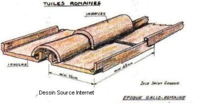 longitudinaux fortement relevés, c’est la tégula (de tegere, couvrir); elle est posée sur le support ; l’autre, qui a conservé la forme canal, est posée sur la jonction longitudinale de deux tégula, c’est l’imbrex (de imber, pluie) car destinée à protéger des infilrations.