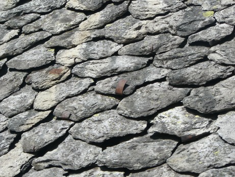Retrouvées près de mille ans après qu’elles sont tombées du toit, on ne perçoit pas toujours bien la différence entre la lauze et l’ardoise, une grosse ardoise, une fine lauze, va savoir ! La certitude, c’est de voir un clou, un de ces clous à tête plate qui enflé par la rouille, a fermé le trou épaufré, fait au marteau, toc ! Pas avant le XIIe siècle.