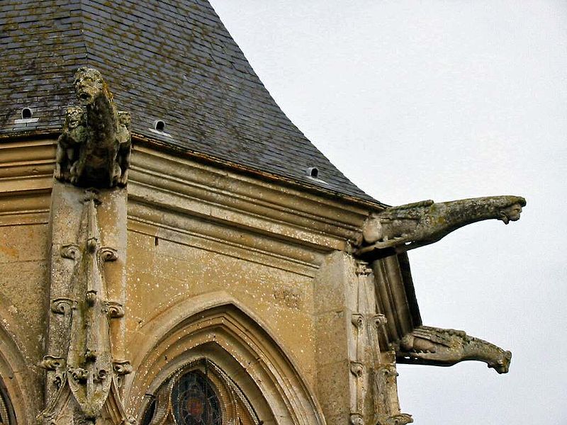 Sur les églises on trouve les gargouilles : Dans le domaine de l’architecture, les gargouilles (étymologie, la gorge ou l’œsophage, du latin, gurgulio, gulia et autres mots similaires dérivant de la racine onomatopéique gar-, par allusion au glouglou de l’eau) sont les parties saillante d’une gouttière destinées à faire écouler les eaux de pluie à une certaine distance des murs. Ces ouvrages sculptés sont souvent ornés d’une figure animale ou humaine typique de l’art grotesque roman puis surtout gothique . Dans les villes du moyen âge l’eau de pluie était rejetée dans le caniveau au milieu de la rue .