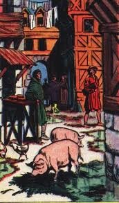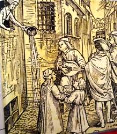 Quatre cent ans plus tard seule la moitié des rues est pavée. Un grand nombre de maisons sont équipées de lieux d’aisance (toilettes) placés dans les greniers qui s’écoulent dans le ruisseau au milieu de la rue. Les gens du Moyen Âge se baignent dans des étuves (bains publics).