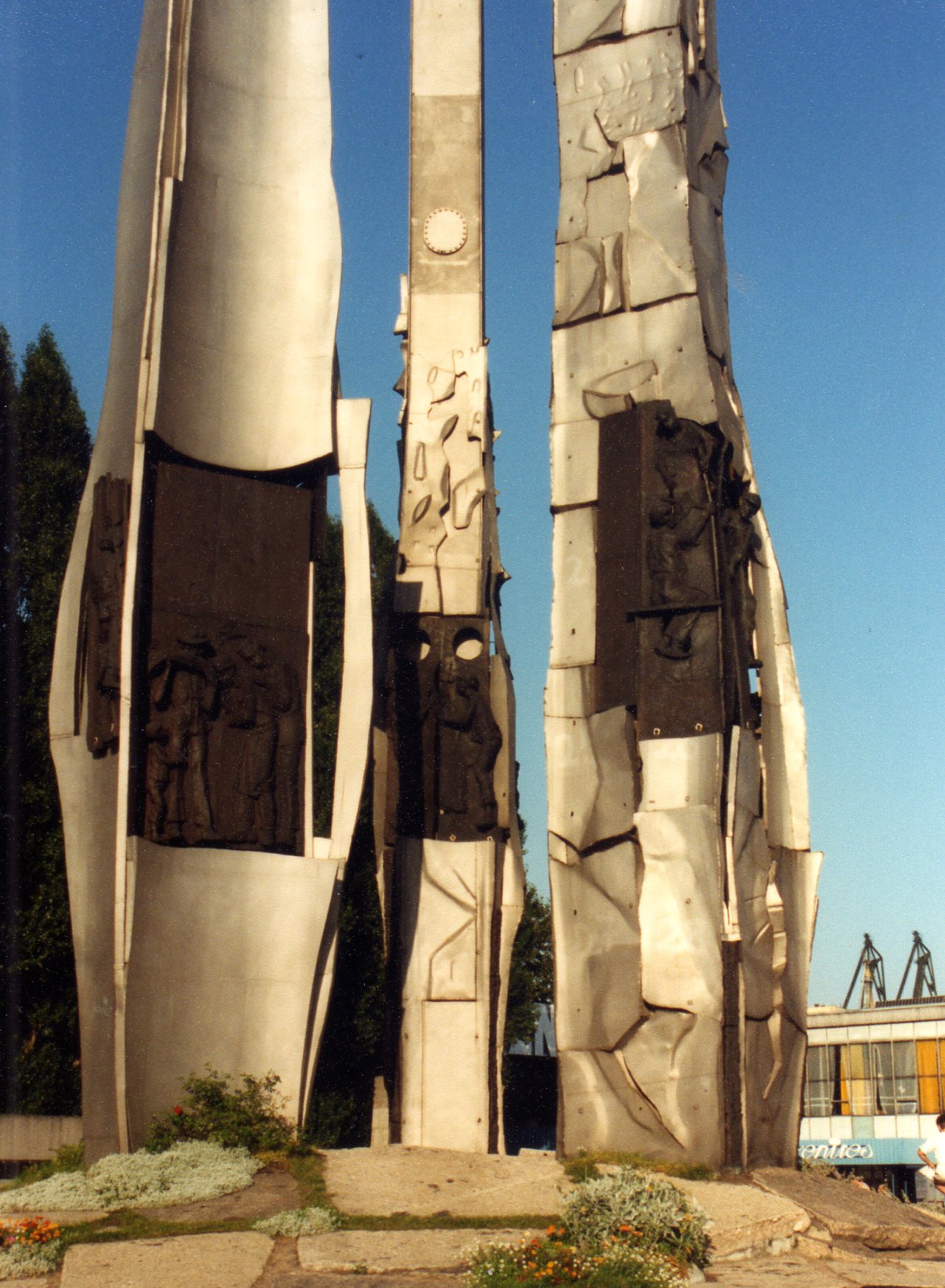 Nous nous arrêtons à l’entrée du chantier naval devant le monument aux morts des ouvriers érigé en 1980 par le Syndicat Solidarnosk « les trois croix ont brisé la croûte de mensonge qui s’est formée à l’endroit où le sang a pénétré dans la terre » .