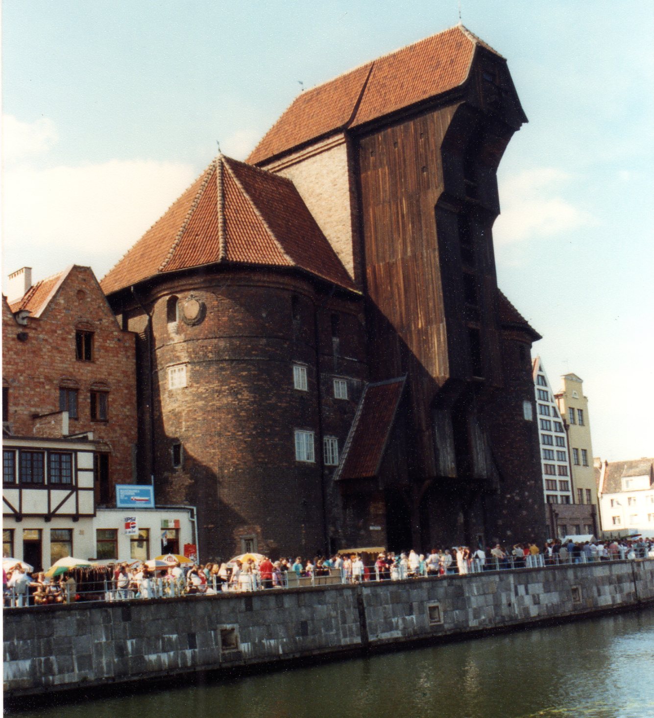 marcher sur le port le long du fleuve Motlava avec un surprenant batiment surplombant les quais et qui faisait office de grue pour décharger les bateaux cette grue portuaire médiévale, appelé ˚uraw est mentionnée dès 1367, reconstruite en 1444. Elle permet de soulever 2 tonnes à une hauteur de 27m et permet, entres autres d’assembler les mâts sur les bateaux.