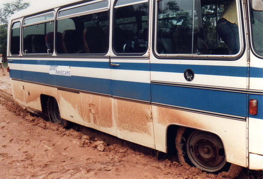 Dans notre marche vers le sud nous subissons une pluie tropicale qui transforme la piste en un véritable cloaque . Tout le monde descend du car embourbé et les hommes poussent le car , aspergés de boue par les roues arrières qui tournent dans le vide en projetant des jets de boue …nous sommes enduits de boue ….nous croisons une 403 Pigeot transportant une dizaine de passagers qui descendent en voltige de la 403 qui franchit la zône boueuse sans problèmes puis remontent après la mare , nous sommes sidérés et chantons les louanges de Peugeot !! Le car enfin sorti de la boue , nous essayons de racler la boue sur nos vêtements avant de remonter dans le car.