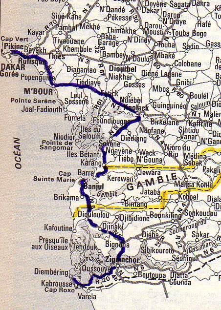 Nous continuons vers le sud et traversons l’état de Gambie qui appartient au Commonwealth . À partir du XVIIIe siècle, les Britanniques occupent ce petit territoire enclavé dans le Sénégal, et les Français n’arriveront pas à les en déloger. Les frontières actuelles ont été tracées en 1889  .Après 1889 et un accord avec la France, le pays devient en 1894 un protectorat britannique.