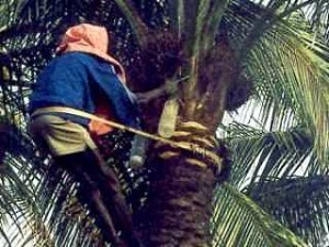 Deux fois par jour, les bouteilles pleines sont remplacées par le récolteur qui grimpe en haut du palmier à l’aide d’une corde passée autour du tronc et de sa taille.