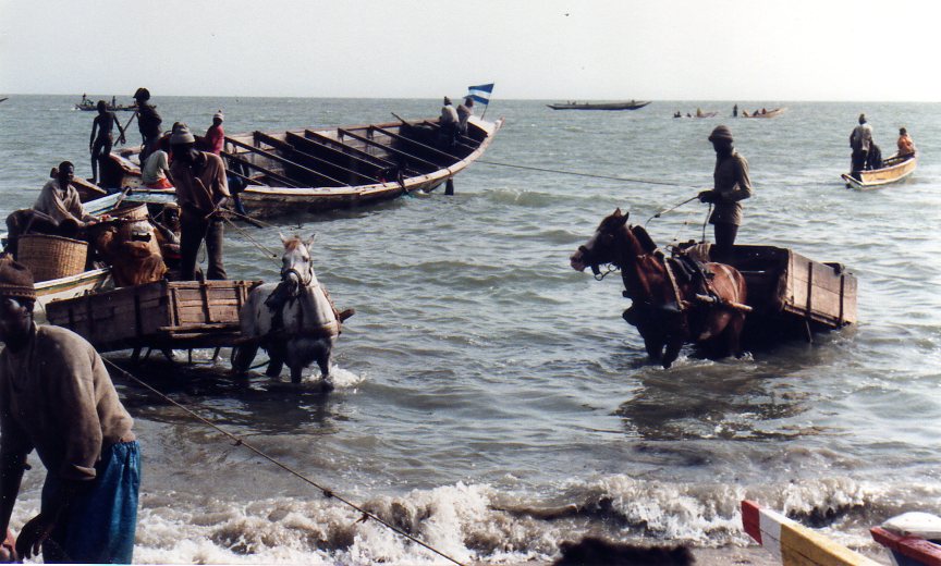 La remontée vers le nord est agrémentée par un arrêt à M’Bour , village de pêcheur où nous assistons à l’arrivée des pêcheurs . L’activité est incroyable : les pirogues sont remplies de poisson qui est débarqué dans des paniers sur la tête des hommes ou sur des charrettes à cheval qui entrent dans la mer !