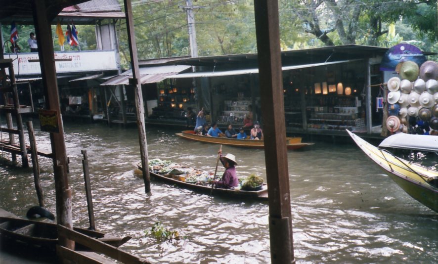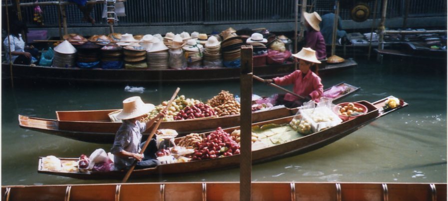 Nous allons visiter le Marché flottant de Damnoen Saduac : c’est un carrefour de canaux qui est le point de rencontre de tous les sampans et pirogues chargés de marchandises : viandes , pains , fruits exotiques , légumes , et bien sur des pacotilles touristiques .