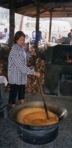 Ensuite dans une grande marmite chauffée , il concentre le sirop brassé en permanence