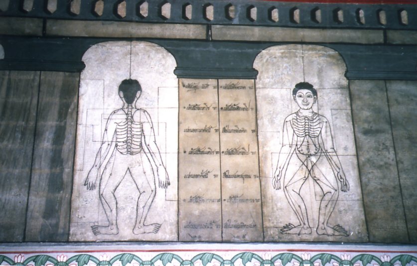 Le pavillon de la médecine traditionnelle comporte des peintures murales décrivant les techniques d’acupuncture et de massage Thailandais .