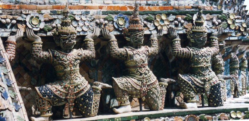 Les peintures murales des galeries du temple du Bouddha d’émeraude racontent l’histoire du Ramakien. L’histoire de la lutte entre le bien et le mal, la lutte entre les humains et les géants mis en place par les Dieux.
