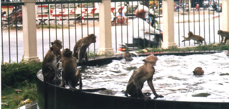 Dans la ville de Lopburi nous sommes surpris par la multitude de singes qui occupent les espaces publics et en particulier ceux qui plongent et nagent dans un bassin sur la place centrale !!.