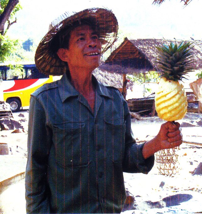 La Thaïlande est le premier pays exportateur d’ananas . Nous avons droit à une démonstration de découpe d’un ananas et à sa dégustation .