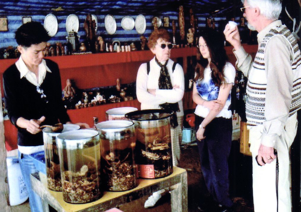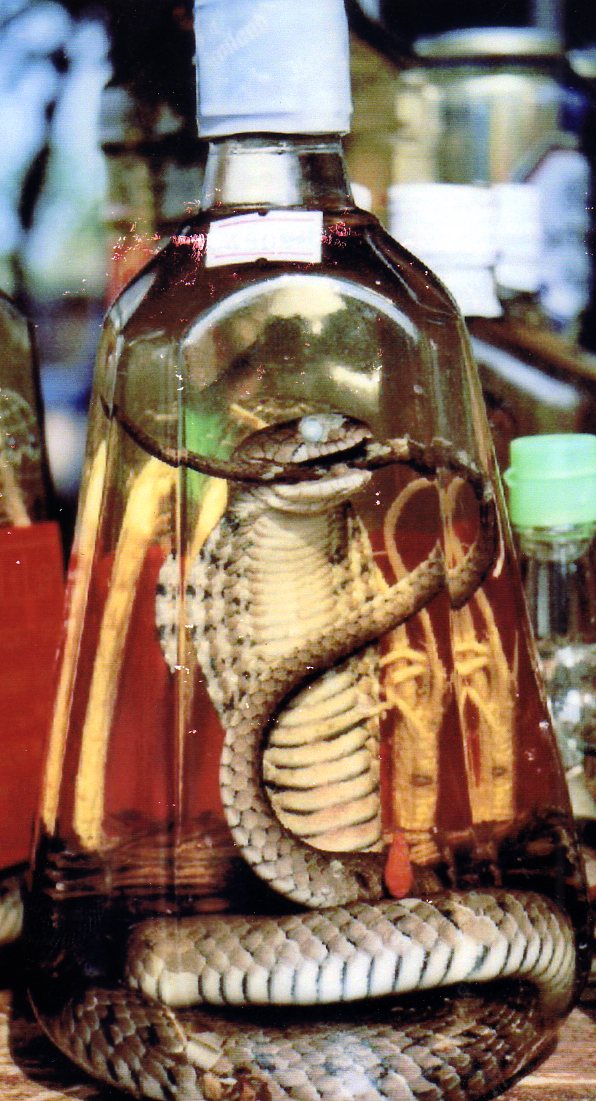 Nous arrivons à l’extrême pointe nord de la ThaÏlande et en Sampan nous passons de l’autre côté du Mekong au Laos . Une boutique sur la rive du Mékong propose des marchandises « hors taxes » Je me laisse séduire par un serpent conservé dans l’alcool .