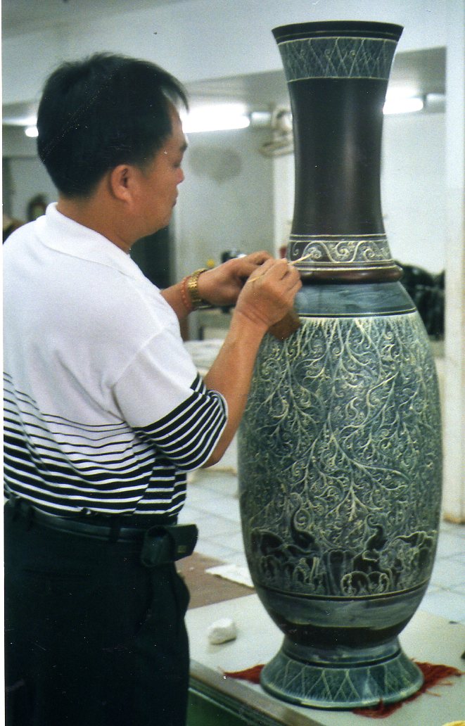 Nous visitons le Centre artisanal de Chilang Maï avec des « métiers » aussi variés que la fabrication des ombrelles , le tissage de la soie , la taille des pierres précieuses et …la poterie et la décoration en coquille d’œuf .