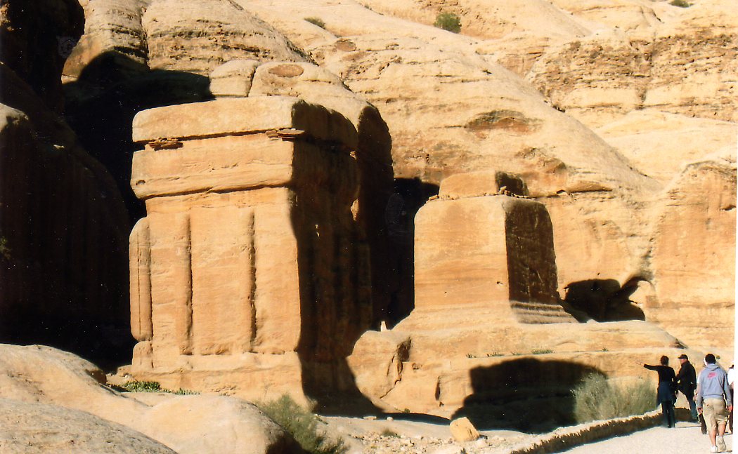 Avant d’arriver au Siq, après un petit kilomètre , le chemin passe devant les tombeaux de Gaïa, la nécropole nabatéenne : Il s’agit de trois tombeaux monolithiques, suivis de deux tombeaux superposés et datés du I° siècle après J.C.