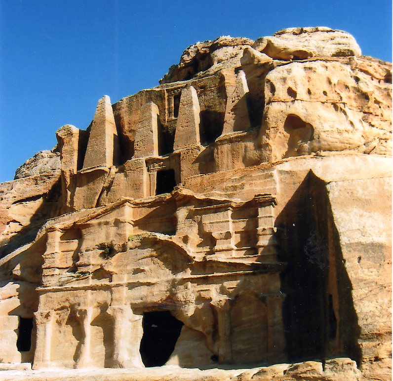 Mais nous sommes obligés de nous plonger dans les guides :… Les Nabatéens (en arabe : «‰√Ê»«◊ al-Anb®ª¢∞?) sont un peuple commerçant de l’Antiquité vivant au sud de la Jordanie et de Canaan, et au nord de l’Arabie actuelle, ils étendirent leur territoire vers le nord, jusqu’à la région de Damas. Leur territoire est frontalier de la Syrie, de la péninsule Arabique, de l’Euphrate et du nord de la mer Rouge. À la suite de l’intervention de Pompée(64 av. J.-C.), le royaume nabatéen devint un royaume client de Rome, mais il conserva une large autonomie. Sa capitale était la cité troglodytique de Pétra, située aujourd’hui en territoire jordanien.