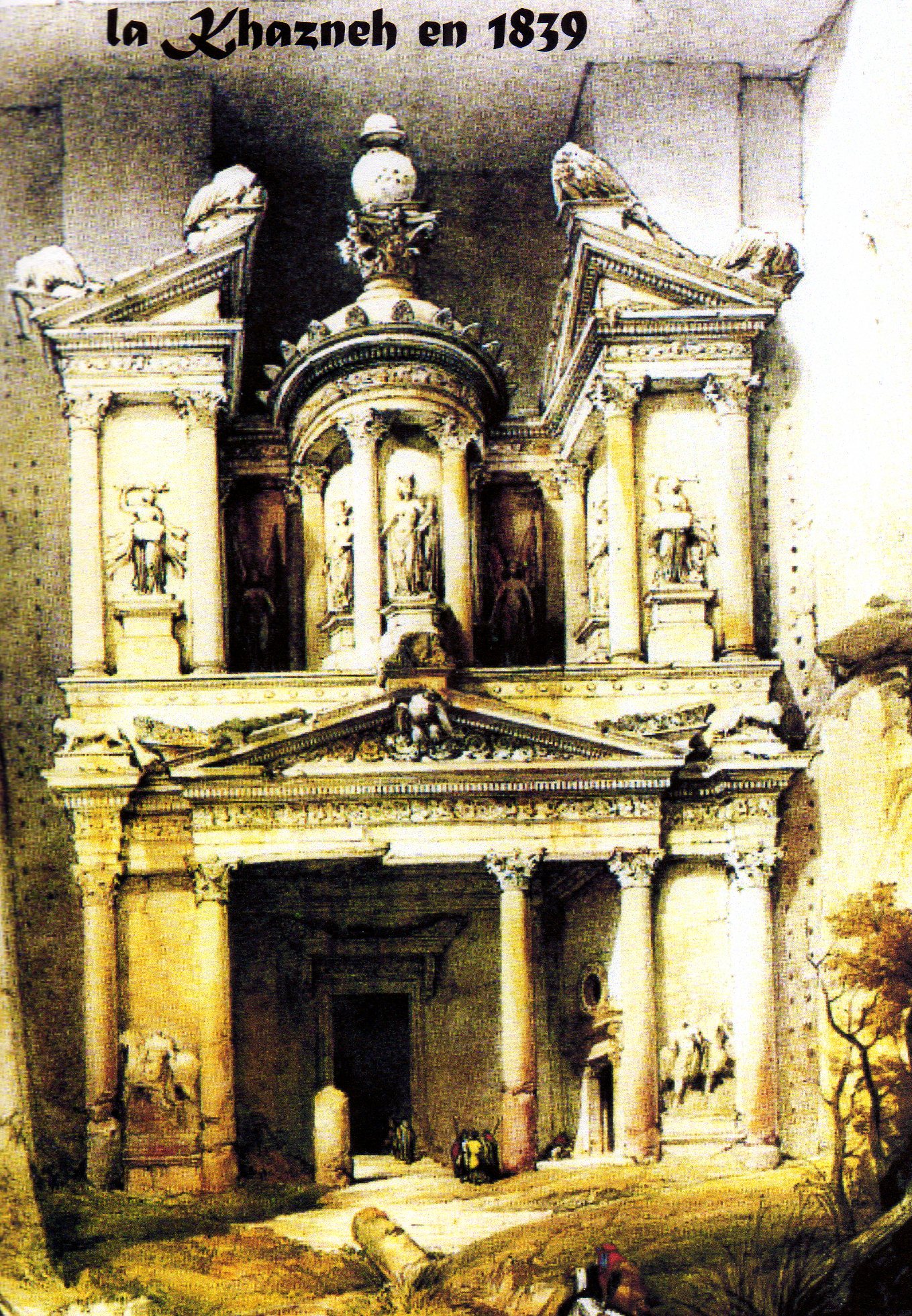 Le dessin de David Roberts permet de voir dans quel état il a été découvert . (David Roberts visita Petra en 1839 au cours d’un long voyage en orient . Vêtu à l’arabe , il voyagea avec une caravane de vingt chameaux et des gardes du corps arabes . Petra fut le point fort de son périple , mais la visite fut écourtée en raison de tension avec les tribus locales . A son retour en Grande Bretagne , ses aquarelles furent reprisent sous forme de lithographies par le belge Louis Haghe et exposées en 1840