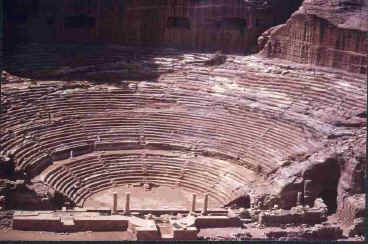 Après le khazneh le site s’élargit et nous arrivons dans la ville basse , et , successivement nous découvrons le théâtre qui bizarrement a été taillé dans la roche par les nabatéens et non par les romains . Cependant il fut ensuite agrandi par les Romains au détriment de la nécropole. C’est un théâtre de plan classique. Il est constitué de 34 rangées de gradins faisant face à un bâtiment de scène dont il ne reste que les fondations et quelques colonnes. De 3 000 à 4 000 spectateurs pouvaient y prendre place. Sous la scène étaient aménagés des magasins et le logement pour recevoir le rideau durant le spectacle. L’orchestre atteint 50 mètres dans sa plus grande largeur. Endommagé par le séisme de 363, il ne fut totalement abandonné qu’après celui de 747.