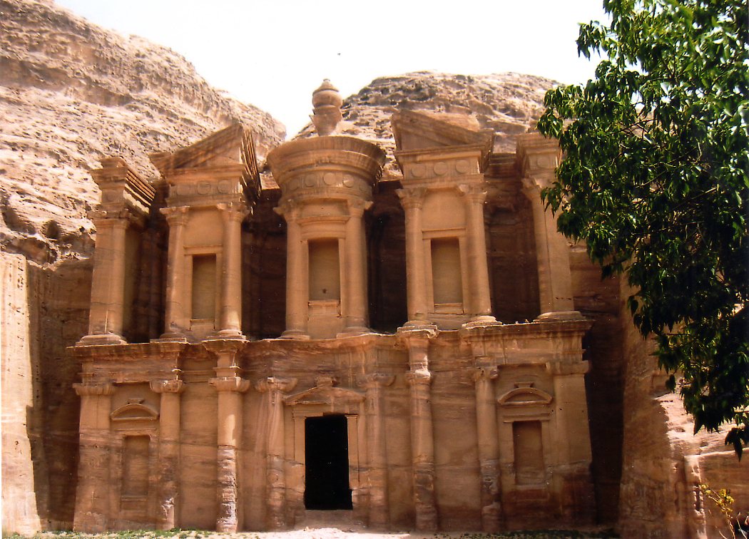 La façade du Deir de 45 m de large sur 42 m de haut semble liée à un rite funéraire probablement celui du roi nabatéen Obodas Ier divinisé qui accéda au trône en -96. Une imposante urne funéraire de 9 m de haut se trouve à son sommet et est accessible par un escalier. Par la suite, le bâtiment sera réutilisé par les Chrétiens comme monastère, ce qui lui vaut son nom actuel . Contrairement à l’idée longtemps soutenue, il ne s’agit pas d’une tombe royale, mais d’un monument cultuel. Il constitue le plus grand monument de Pétra : 47 mètres de large, L’entrée elle même est colossale : le seuil de la porte est aussi haut qu’un homme.