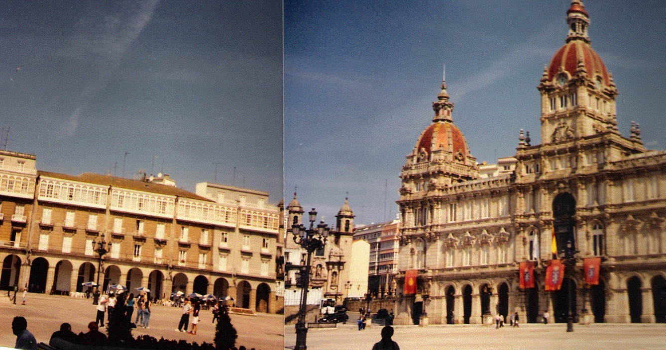 Nous admirons la Plaza Maria Pita entourée sur trois côtés d’édifices à galeries vitrées et sur le quatrième de l’hotel de Ville