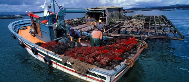 Les bateaux sont équipés d’un bras hydraulique articulé pour manipuler les sacs de moules .