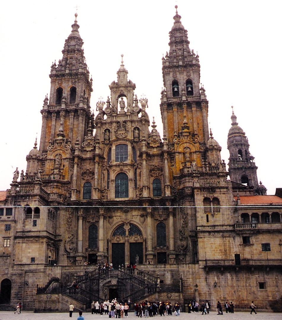Nous arrivons au terme de notre « Chemin de Saint Jacques deCompostelle »La cathédrale actuelle est un édifice roman, construit en granit, dont les travaux ont débuté en 1075, avec l’évêque Pélaez, et grâce à l’élan donné par l’évêque Gelmírez, ainsi que le roi Raimond de Bourgogne (v. 1059-1107), époux de la reine Urraque Ire de Castille (1081-1109-1126), ils furent terminés en 1211. La facade principale de la Cathédrale  dite de l’Obradoiro (œuvre d’ or)a été construite au début du 18ème siècle dans le style baroque . L’escalier et le perron renferment la vieille cathédrale romane du 12ème siècle .
