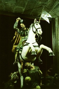 « en 844 les espagnols livrent un combat désespéré contre les maures .Soudain apparaît un cavalier monté sur un cheval tenant un étendard blanc frappé de la croix rouge , c’est le tueur de Maures , le Matamore , c’est la reconquête qui commence !!!