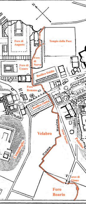 Mais si les Romains organisent l’arrivée de l’eau dans la ville , ils doivent se préocuper de ce qu’on appelle actuèlement les eaux usées : La Cloaca Maxima est le grand égout collecteur qui, dans la Rome antique, desservait le Forum Romanum et débouchait sur le Tibre.(voir à droite le tracé sinueux de cet égout pour desservir la cité antique )