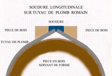 En effet le plombier romain n’avait pas à sa disposition de tube de plomb , mais seulement des plaques de plomb , il devait donc enrouler la plaque sur une pièce de bois , du diamètre souhaité et ensuite procéder à une soudure en coulant du plomb sur les bords de la plaque . Cependant on peut imaginer que la pression de l’eau dans ces canalisations ne pouvait être importante …….l’eau coulait surtout par gravité et non par pression .